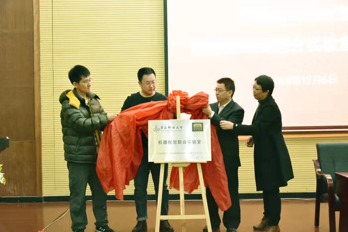 院长刘喜梅,精锐视觉公司技术总监孙旭光一起为“机器视觉联合实验室”揭牌。