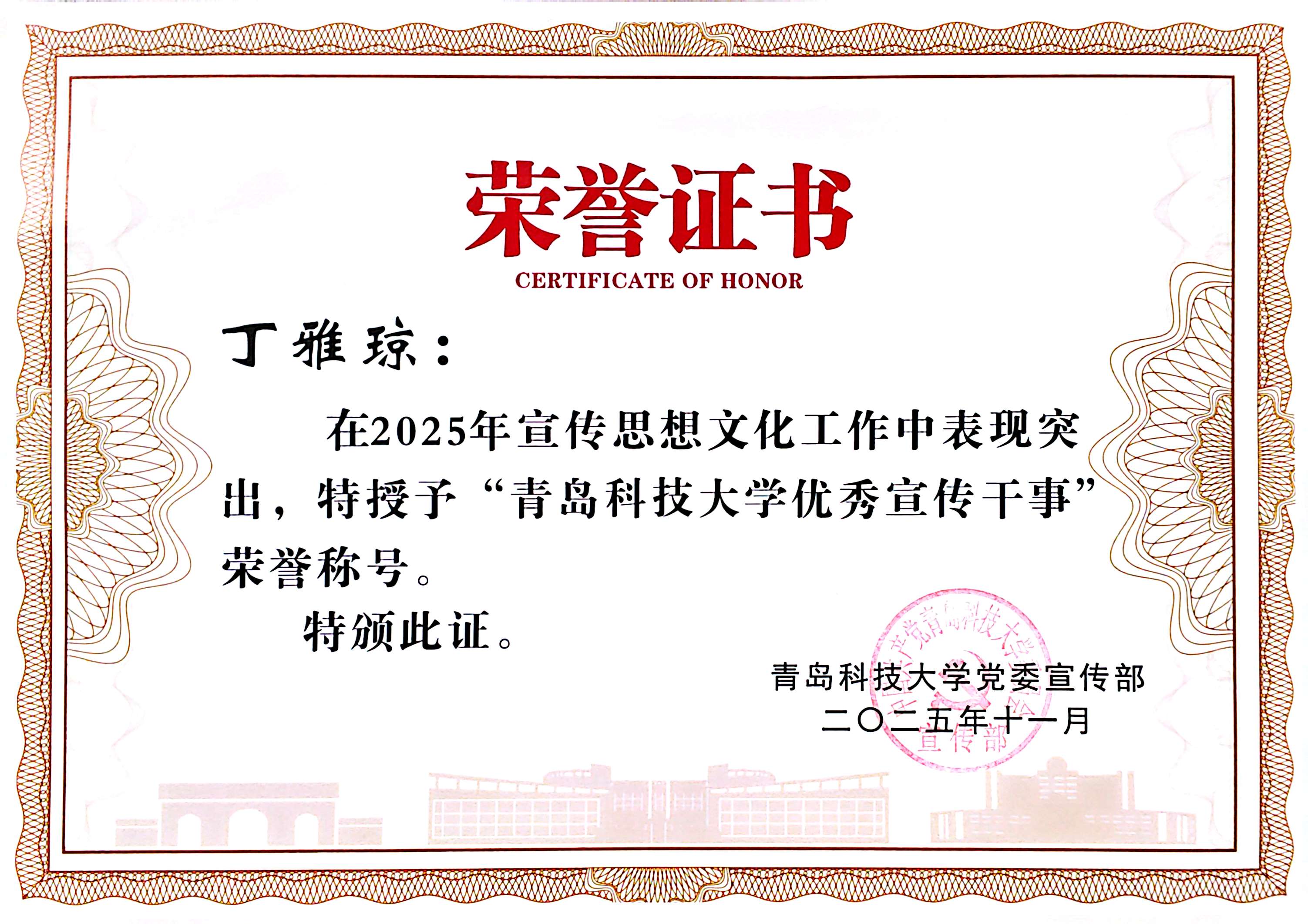 宣传干事,工作期间展现出极强的专业素养与责任担当。她不仅牵头策划了多项主题宣传活动,还悉心指导学生会宣传部,从选题构思到内容打磨全程跟进,培养了一批优秀宣传骨干。