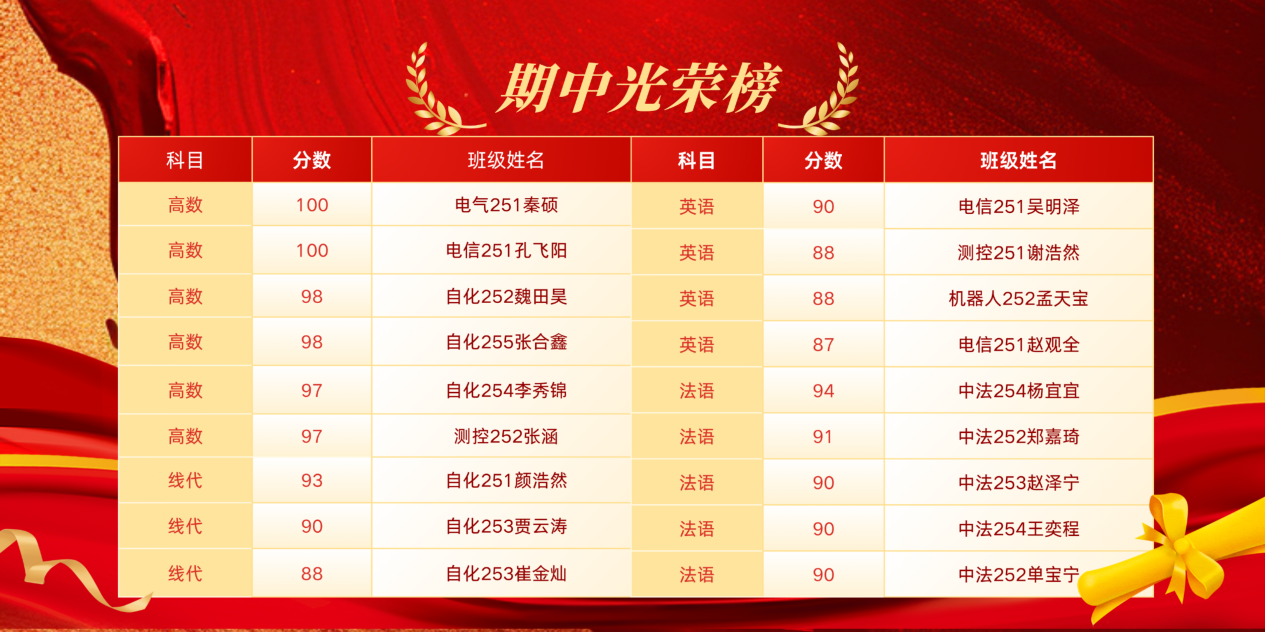依据考试成绩,评选出高等数学、线性代数、外语三门学科的前三名学生,并制作成“期中光荣榜”进行公示表彰。