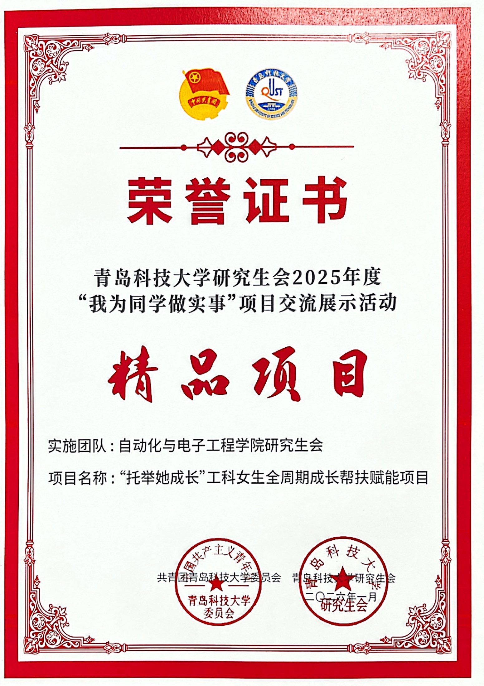 研究生会“托举她成长”项目凭借精准帮扶、全周期赋能的鲜明特色获评精品项目。针对工科女生在学业科研、就业发展、心理调适等方面的痛点难点,项目构建“学业护航-科研启蒙-职场赋能-心理支撑”四维帮扶体系。学业上组建“导师结对+朋辈互助”小组,开展专业课答疑、科研软件培训等活动8场;科研方面链接优质资源,邀请女性教授分享科研经历,组建5支女生科研兴趣小组,助力参与校级及以上科研项目;职场赋能环节设置模拟面试、行业女性分享会,联动企业提供实习信息,帮助20余名女生明确职业规划;心理支撑上开通“暖心树洞”服务,开展团体心理辅导,筑牢成长防线。