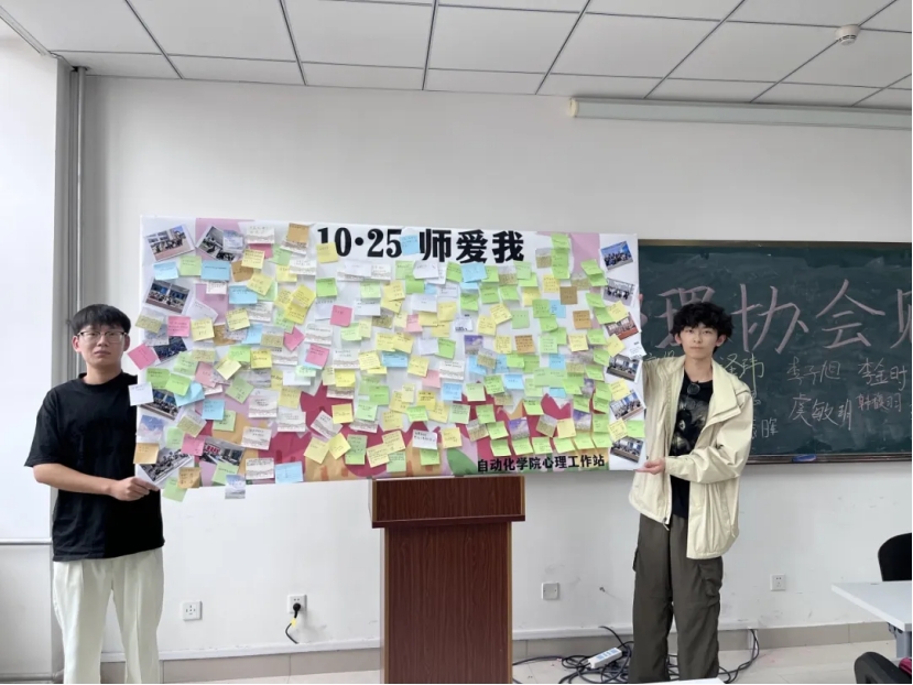 各班心理委员带来了全班同学的合照以及心愿便利贴,“10.25师爱我”展板上贴满了书写着同学们美好心愿的便利贴。