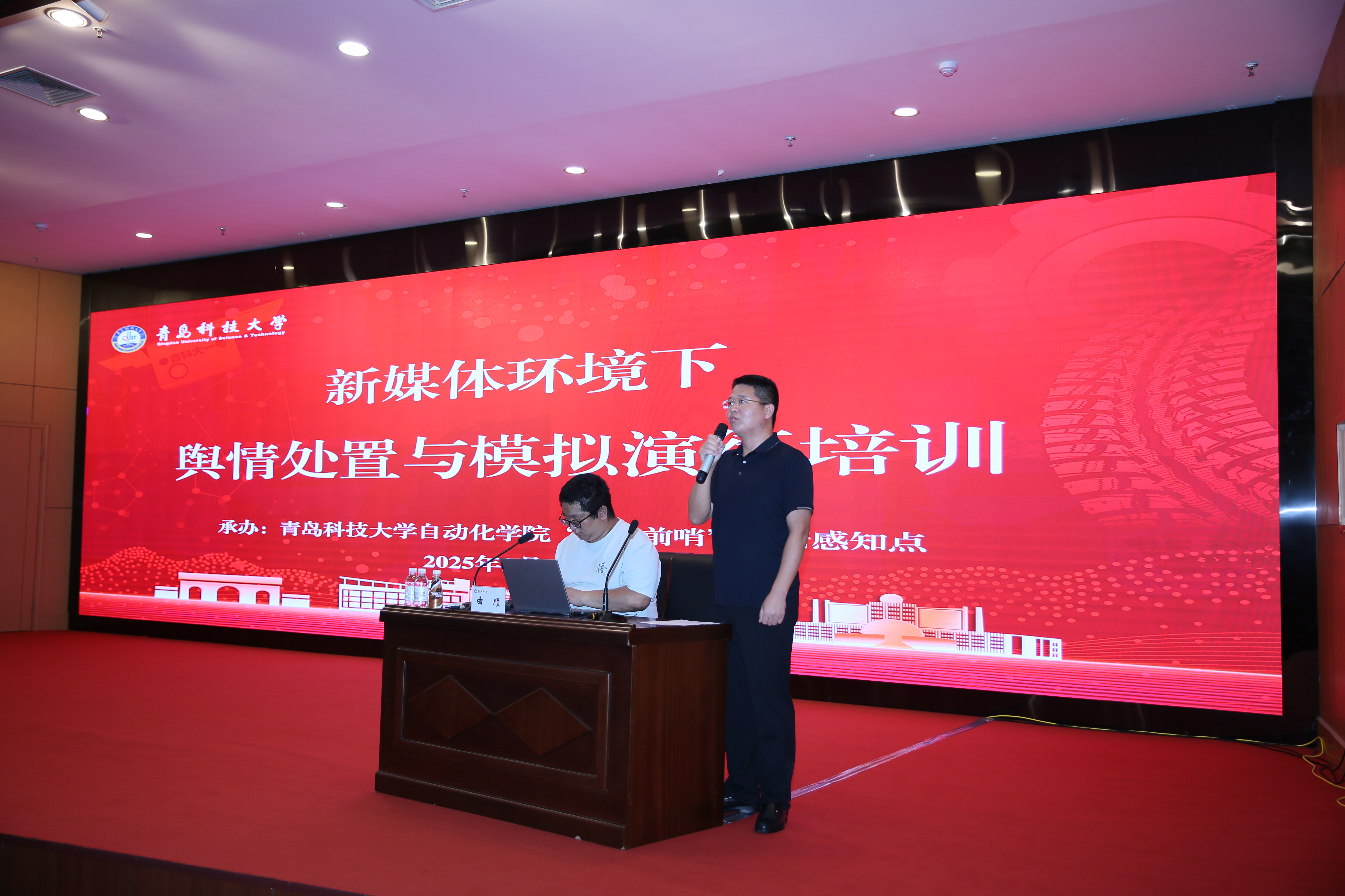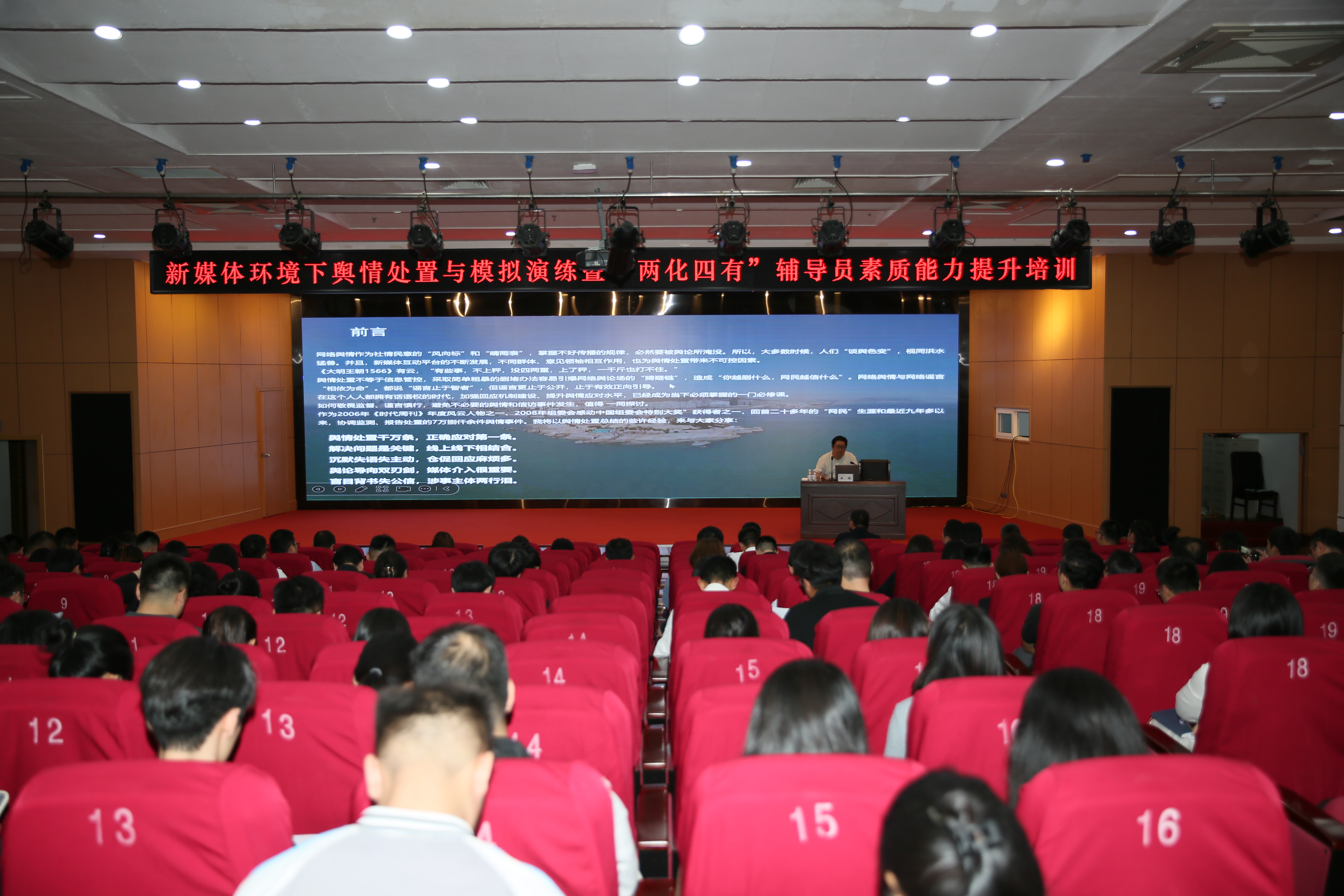 为切实增强学校干部的舆情风险意识、舆情处置能力和舆情应对实战经验,9月26日,学校举行新媒体环境下舆情处置与模拟演练暨“两化四有”辅导员素质能力提升培训会,邀请山东省互联网传媒集团(大众网青岛)编辑记者、舆情分析师曲顺来校作专题培训。培训会由学校党委宣传部副部长贾可好主持。