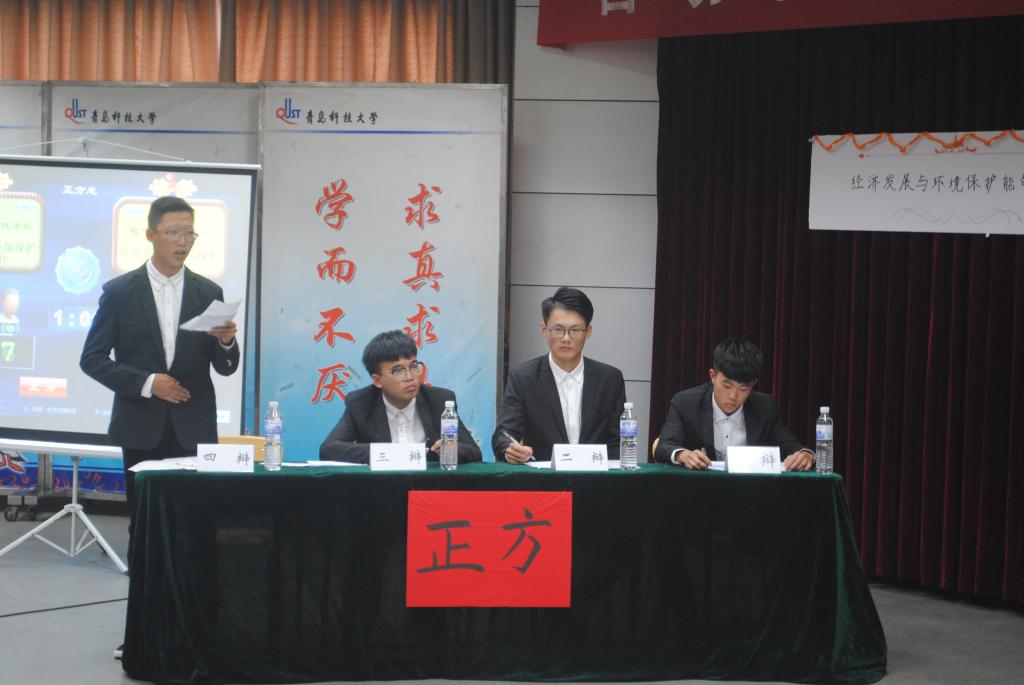 双方辩手做完自我介绍后,比赛正式开始。陈词环节中,正方一辩引用习近平总书记的“青山绿水就是金山银山”,提出党的十七大和十八大就已经对环境保护做出了明确的规定,指向其“经济发展与环境保护能并行”这一观点。而反方一辩则从理论上分析了经济的增长需要人减少对自然的干预,认为二者并行不切实际。