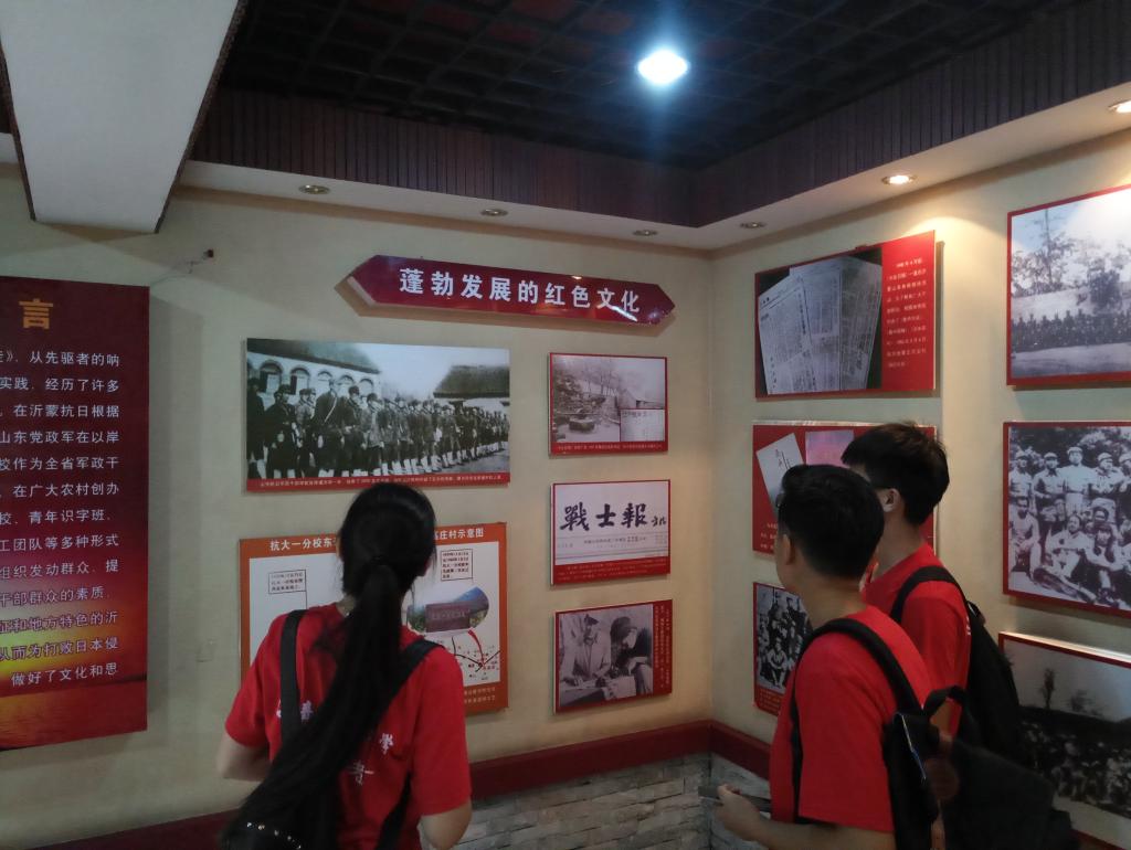 实践团在红色纪念馆文化教育展厅中进行参观,展厅分成了四个展区,分别为文艺宣传、新闻出版、干部教育和群众教育。队员们通过自己的学习和解说员的讲解,学习到了很多书本未涉及的内容,获益匪浅。115师战士剧社、抗大一分校文工团、鲁迅艺术宣传大队等文艺团体在沂蒙成立,文艺战士们将戏剧带到了田间地头、带到人民群众和部队指挥员中间,丰富了根据地老百姓的文化生活,提高了沂蒙人民的文化觉悟和思想觉悟。队员们不禁想到了老人们说道的一些优秀文艺作品,如《跟着共产党走》、《沂蒙山小调》等家喻户晓的革命歌曲。《沂蒙山小调》还被联合国教科文组织确定为中国优秀民歌。同时,新闻出版事业快速发展,一批批重要的报刊,如《大众日报》、《战士报》、《山东画报》等相机在沂蒙创刊。为提高干部军政素质设立的干部教育机构,根据地大力开展文化教育事业,如山东军政干校、抗大一分校、山东大学等。不仅如此,在极端艰苦的条件下,沂蒙根据地还建立了中学、小学,使群众接受正规的学校教育。队员们无一不对党在文化教育的政策感到深深的叹服。此外,冬学、夜校、庄户学、识字班等农村扫盲教育形式如雨后春笋般涌现。“识字班”现在也成为了沂蒙地区年轻姑娘的代名词。