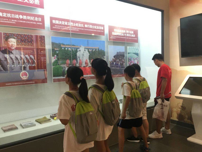 炎热的天气并没有丝毫阻挡孩子们对于革命烈士纪念馆的热情,跟随着讲解员的步伐,孩子们和志愿者们进入到抗日厅中,讲解员声情并茂的讲述了抗日战争时期中国人民顽强拼搏、英勇杀敌的精彩事迹。从抗日物件到收缴的战利品,从抗日英雄到革命先烈,精彩的展品吸引着孩子们的眼球。他们争先恐后的与战争时期的诸如油灯、锣、镲以及三八大盖等电视机中出现的物件合影,并且仔细地研读展品中所介绍的英雄事迹。在参观博物馆的同时,他们也在寻找时机完成自己的任务,礼貌地采访路人关于博物馆的感受并得知他们不同的职业。