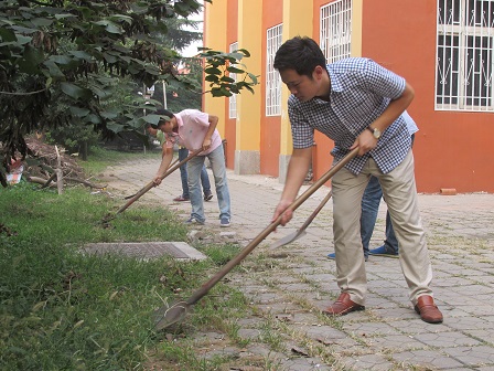 学生辅导员刘海波与学生党员同志一行于四方校区二教西礼堂一带卫生进行了全面清扫,确保不留卫生死角。