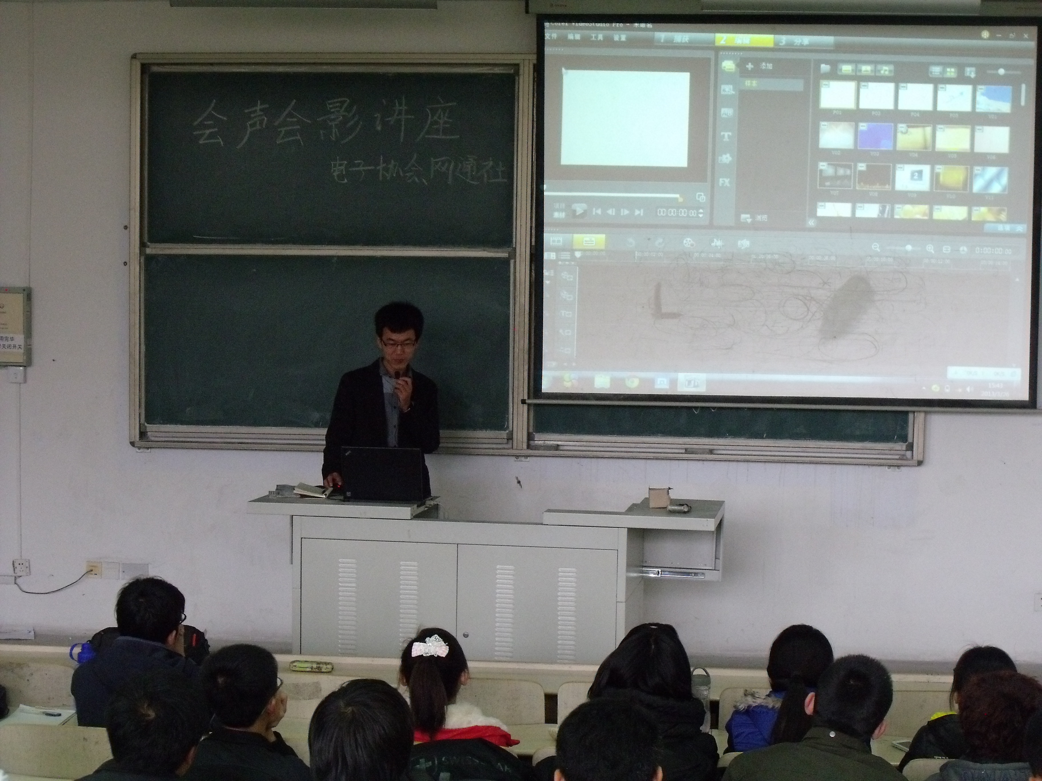 讲座三点半正式开始,讲座由电子爱好者协会会长刘开合主持并发言,参与人员主要为电子爱好者协会和网通社成员。讲座开始,首先电协会长刘开合为大家播放了自己制作的视频,从而将话题引进。随后,结合幻灯片为大家讲解了用照片如何做电子相册的全部过程,并且针对几个方面为同学们做了详细的解说,同时自己示范为同学们做了一遍。接着,刘开合会长又以自己制作的视频为主为大家讲解剪辑视频的全过程。剪辑视频软件主要以“会声会影”为主,从如何破解软件以及对视频捕获、剪接、转场、特效、覆叠、字幕、配乐做了详细的示范解说,并对同学的疑问做了回答。最后,会长希望同学们也能制作一个视频,深入对“会声会影”的了解。