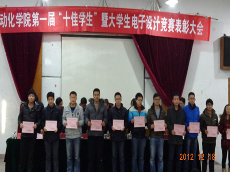 第一届“十佳学生”评选以及组织、培训学生参加2012年山东省大学生电子设计竞赛情况的讲话;大会第二项由学生处副处长鲁伟宣读表彰“十佳学生”决定;第三项由校团委副书记曲慧敏宣读2012年TI杯山东省大学生电子设计竞赛获奖名单;随后各领导为获奖同学颁发证书;第五项由获奖同学代表陈萌发言,表达了认真学习十八大精神,让自己的青春无悔的决心;大会最后一项党总支书记张景瑞发表讲话,发言中张书记首先对获奖同学表示祝贺,同时又表达了对大家努力学习做出成绩的要求以及殷切祝福。
