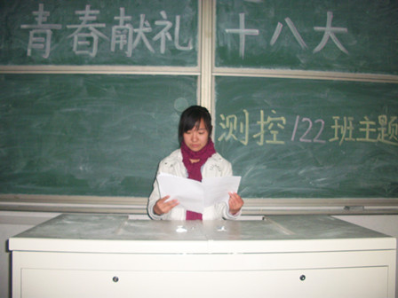 11月8日,在十八大胜利召开之日,测控122班举行了以“高举团旗跟党走,青春献礼十八大”为主题的班会。