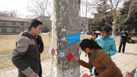 美丽的青岛科技大学内树木繁多,已成为学校内一道亮丽的风景。3月12号中午下课后,青年志愿者协会的志愿者们在图书馆前集合,虽然大部分人还没吃饭但仍旧兴致昂扬。他们把提前准备好的宣传标语拿出来,走遍了学校的各个角落,把宣传标语张贴在树上,以提醒同学们注意保护树木。“地球是我家,绿化靠大家”、“小草青青,脚下留情”、“一花一草皆生命,一枝一叶总有情”,一句句温馨的标语无不在警醒着同学们,爱护我们共同的家,爱她的一草一木。