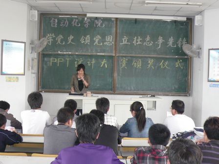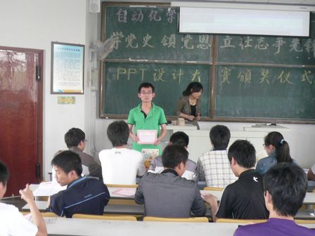 几十份作品,以“庆祝建党90周年 重温党史历程”为总主题,参赛者将自己对党史的感受与理解融入到自己的PPT创作中,以PPT的形式的展示出自己对党艰难发展历程的感想。由于评委时间所限,本次比赛的评奖在昨天已结束,比赛共评出了1个一等奖,3个二等奖,6个三等奖以及优秀奖若干。2:00主持人宣布仪式正式开始,公布获奖者名单,学生会各部副部为各位获奖选手颁发奖品及证书,并在最后为到场的选手及观众放映了一等奖获得者倪源同学的作品。倪源同学的作品中包含了自己制作的视频、图片等,这些元素展现出了选手们丰富的想象力和创造力,他的作品表达出对共产党的艰难历程进行了深刻的探索和敬重之情。