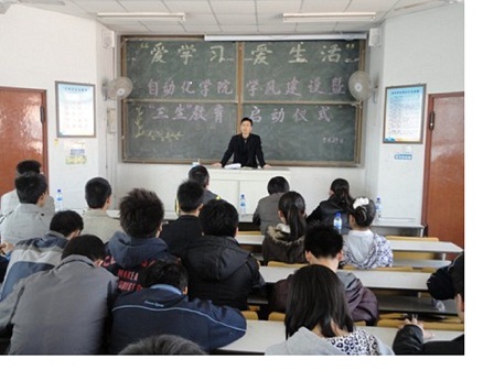 继而,肖强老师发言并宣布活动启动。在讲话中,肖强老师就教风学风建设中的薄弱环节作出明确指示,从课堂、考前复习及考风考纪三个方面作了简要分析。他提出应加大辅导员、班主任、学生会及班级干部的管理力度,力争在严格的纪律下为学生提供更加有效的学习环境,并对提高学习效率提出几点建议,如组成互帮小组等;与此同时,肖老师强调学风建设的内因即学生主体应当重视起来,巩固基础课,加强专业课,全力以赴。最后,肖老师就“三生”作出了更为详尽的引导,他讲到,作为当代大学生,应珍惜生命,端正心态,树立正确的人生观;应热爱生活,养成良好的生活习惯,提升自身素质和修养;应具备一定的生存技能,在实践中获得经验,并尽可能地完善自己,全面发展,以适应就业需求和日后的工作生活。
