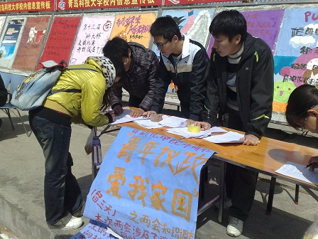 中午12点左右,该协会会员已经做好准备,并拿着调查问卷吸引过往同学的参与。本次调查问卷采用匿名制,调查主要涉及两会有关的内容,在调查中可以发现大部分同学对两会情况有所了解,但并没有积极主动的去了解,对两会的常识问题并不清楚还有待于提高。当被问及对大学生参政议政的看法时,大家都表现出极大的兴趣,并对那些行动者表示赞赏,希望自己也有一次机会。