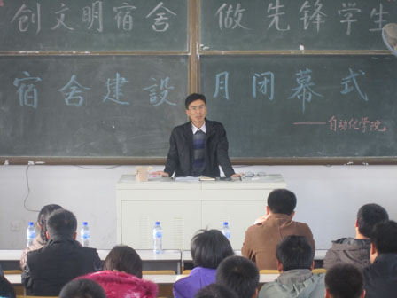 最后,肖强讲话。他首先对获奖宿舍的同学表示祝贺,号召大家继续弘扬宿舍文明建设月期间表现出来的积极向上的精神,规范自己的行为,养成良好的习惯。随后,肖书记对同学们提出了三点要求:一是要认真总结此次活动的成功经验,统一思想,提高认识,站在文化育人,环境育人的高度,认真抓好宿舍文明建设;二是要充分发挥广大学生党员、学生骨干的模范带头作用,为广大同学做出表率,将文明月中好的作风、好的习惯一直延续下去;三是要进一步创新工作思路,注重工作成效,通过开展丰富多彩的宿舍文化活动,带动宿舍文明建设的积极性,使我院宿舍文明建设上一个新台阶。最后,肖强又对同学们即将面临的期末考试提出几点建议,他强调了同学们要全身心投入复习,在考试中一定不要作弊等问题。