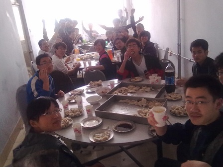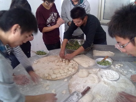 下午2:00包饺子活动正式开始。同学们分成3组,每组都是男女搭配组成,比赛开始后同学们忙的热火朝天,但是忙而不乱,分工明确,男同学负责擀皮,女同学负责包水饺,配合默契。很快,饺子包好了,尽管展现在我们面前的饺子奇形怪状,但这也是同学们辛勤劳动的结果。接下来是煮水饺了,同学们把水饺放到沸腾着的热水里,不一会,热腾腾的饺子就煮好了。同学们一边吃饺子,一边举行了各种互动游戏:相互喂水饺,吃水饺比赛,还有歌曲对唱等,屋里充满欢声笑语。