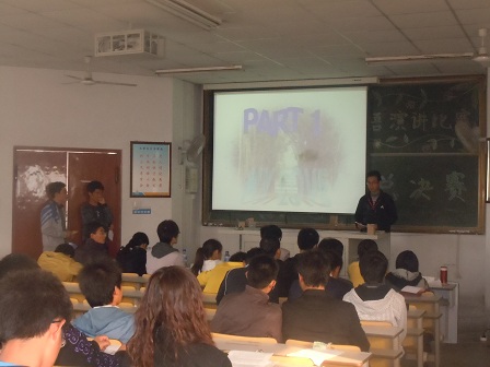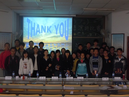 此次比赛的主题是“Love”,共有是11位选手参加比赛,大赛将产生一等奖一名,二等奖两名,三等奖三名。此次大赛共设有三个板块:第一个版块是“My Love”,就是让选手围绕这个主题来阐述自己的看法,说说自己的感想,该主题在比赛前就已经通知了选手,因此选手们准备的都很充分,演讲也非常精彩;第二个板块是即兴演讲“Action” ,选手现场扎破气球抽取题目,并有两分钟的时间即兴演讲,选手们的演讲赢得满堂喝彩;第三个板块是“Our Shows”,比赛形式就是将所有选手分为两组,每组都表演一出话剧,参赛选手都表演的非常精彩,非常有喜剧性效果,给观众留下了深刻印象。各个模块之间还穿插了观众互动环节“Happy Together”,其中包括猜单词游戏和猜歌名游戏,深受观众欢迎。比赛进行的同时,每个选手的分数也在紧张有序的统计中,最后由嘉宾及评委为获奖选手颁奖,大赛圆满结束。