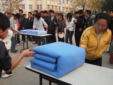 电信101班积极参加了此次活动。活动共分为三项,在第一项单人组限时三分钟比赛中,张新月同学手法娴熟、动作规范迅速,在短时间内就征服了在场的评委,使电信101班在第一项比赛中取得了95分的好成绩。同样在第二项男女双方合作限时5分钟比赛中,刘文荣和颜文积极配合,团结合作,最终也取得了不错的成绩。最后一项才艺表演中,卢序良为大家奉上了一段精彩的评书。经过大家的共同努力,在这次“我爱叠军被”活动,电信101班取得了第二名的好成绩。