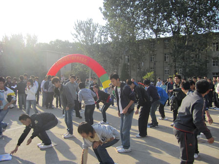 讲话过后,各项比赛活动正式开始。同学们热情高涨,激情满怀,投入到一场激烈的“战斗”中去。他们积极地参与了蚕行、夹气球、夹球竞跑等趣味横生的游戏活动。每个班都是集体出动,他们在四个比赛区里轮回作战,紧张的比赛过后,还有机智灵活的知识竞答。啦啦队队员们更是热情洋溢,一时间,原本清冷的小五四变成了欢乐的海洋。在一场场激烈的角逐之后,最终,夺得团体冠军、亚军和季军的班级分别为自动化4班、电气1班和自动化5班。