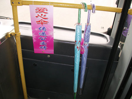 赴潍坊科学发展观实践服务调研团顺利到达潍坊。队员们在前往住宿点的公交车上,看到了带有潍坊特色的爱心伞。