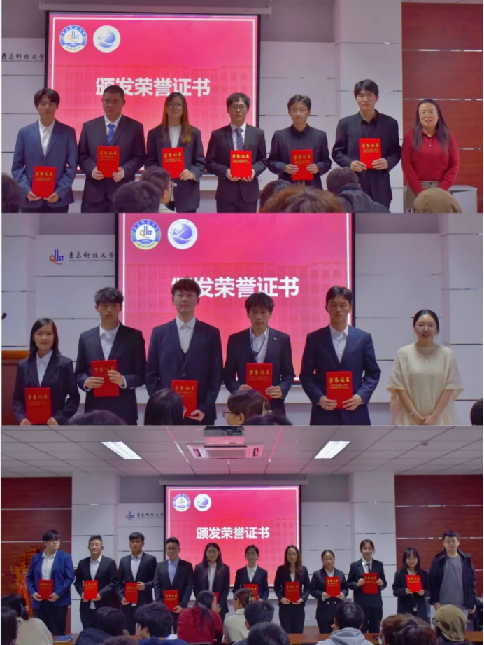 会上,郭蒙蒙、安柏雅、马仁轩分别为获得表彰的优秀学生会、研究生会干部及志愿者颁发荣誉证书。