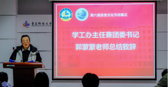 郭蒙蒙在闭幕式上致辞,她回顾总结了本届宿舍文化节中叠军被、优秀宿舍评选、消防安全演练、宿舍风采大赛等系列活动取得的良好效果,同时就宿舍建设向同学们并对同学们提出三点建议:一是树立“宿舍是我家,宿舍内务靠大家”的全局观念,做到团结友爱、互相尊重;二是树立“劳动最光荣”的思想,做到内省慎独,共同营造卫生整洁的宿舍生活环境;三是树立“安全重于泰山,生命高于一切”的安全防范意识,增强处理突发事故的能力,确保宿舍的安全和稳定。她指出,宿舍文化作为校园文化的重要组成部分,是扎根学生、服务学生、浸润学生的健康文化,对学生性格塑造、综合素质能力提升具有举足轻重的作用,希望同学们在今后的宿舍文化生活中收获知识友谊,收获健康人生。